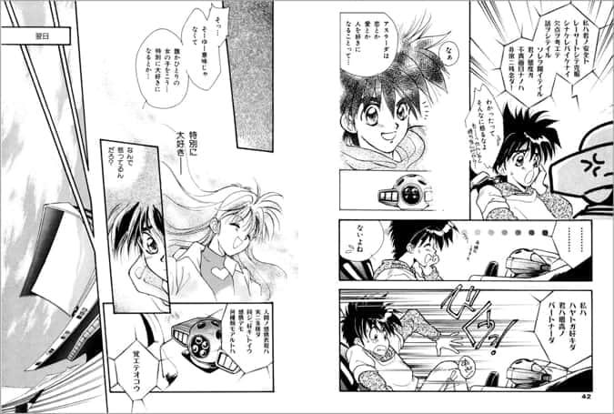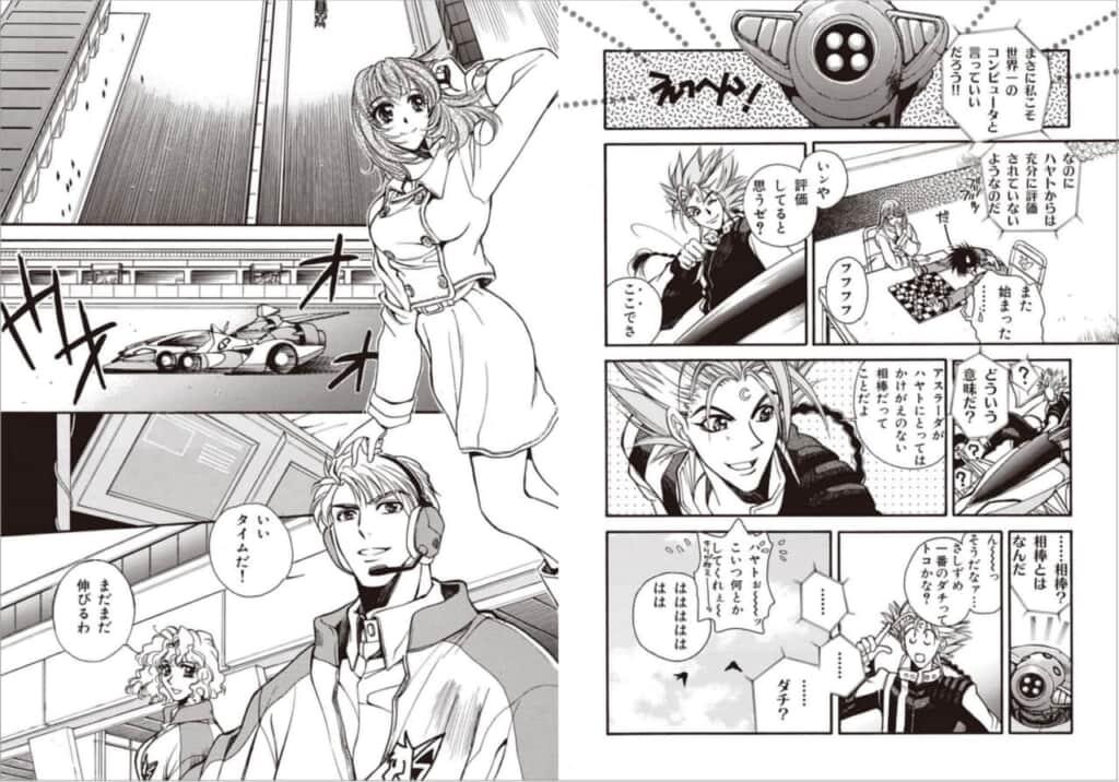 - 『新世紀GPXサイバーフォーミュラ』電子版本文ページより_あすかの女心が理解できないハヤト。恋愛感情を理解できないアスラーダ~ハヤトのマシンに搭載された人工知能~との会話が楽しい『世界でいちばん』