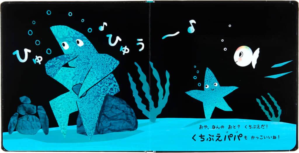 主人公のちっちゃなおさかなちゃんは、黒い海を舞台に、個性あふれるお友だちのパパたちに次々に出会います。