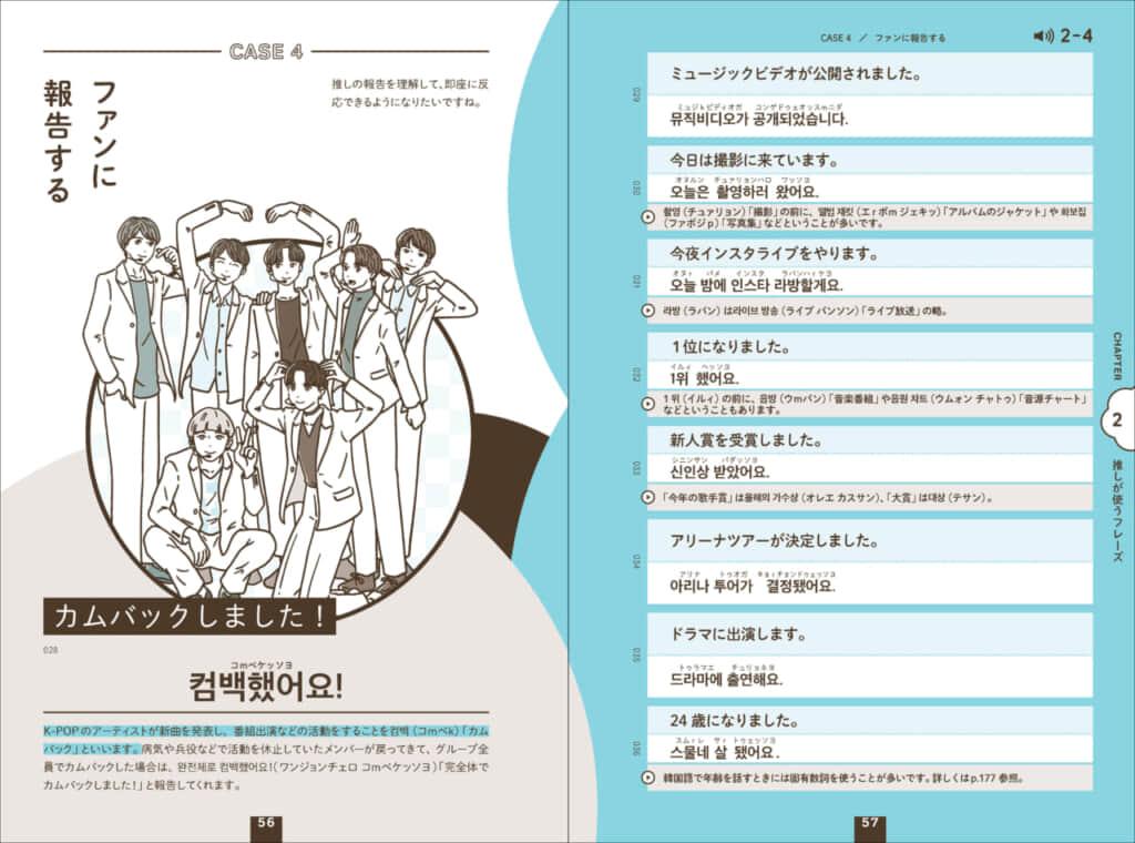 韓国人のエンタメオタク全面協力のもと、「カムバック」「チッケム」などの367語と、「最強の愛されマンネ」「エンディング妖精、優勝してる」などの517フレーズを掲載しています。