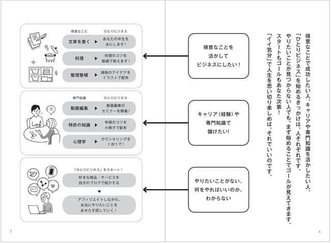 本書は、起業(副業)に興味はあるけれど、自分に何ができるのか、売れるものも才能も何もない、と思い込んでいる“起業1年生“を対象にしています。売れるコンテンツ設計から自動収益化まで、ステップごとに解説していきます。