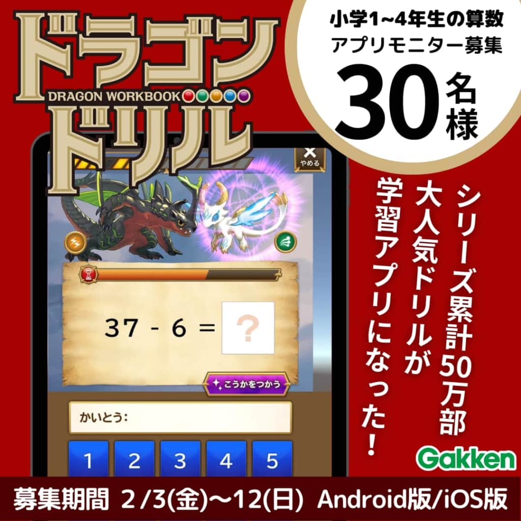 株式会社 学研ホールディングス(東京・品川/代表取締役社長:宮原博昭)のグループ会社、株式会社 Gakken(東京・品川/代表取締役社長:五郎丸徹)が運営する、小学1~4年生向け算数学習アプリ『ドラゴンドリル ~さんすうワールド~』は、iOS/Androidアプリの公開開始にあわせ、2023年2月3日(金)よりモニターを30名募集いたします。モニターの募集締め切りは2月12日(日)となります。
