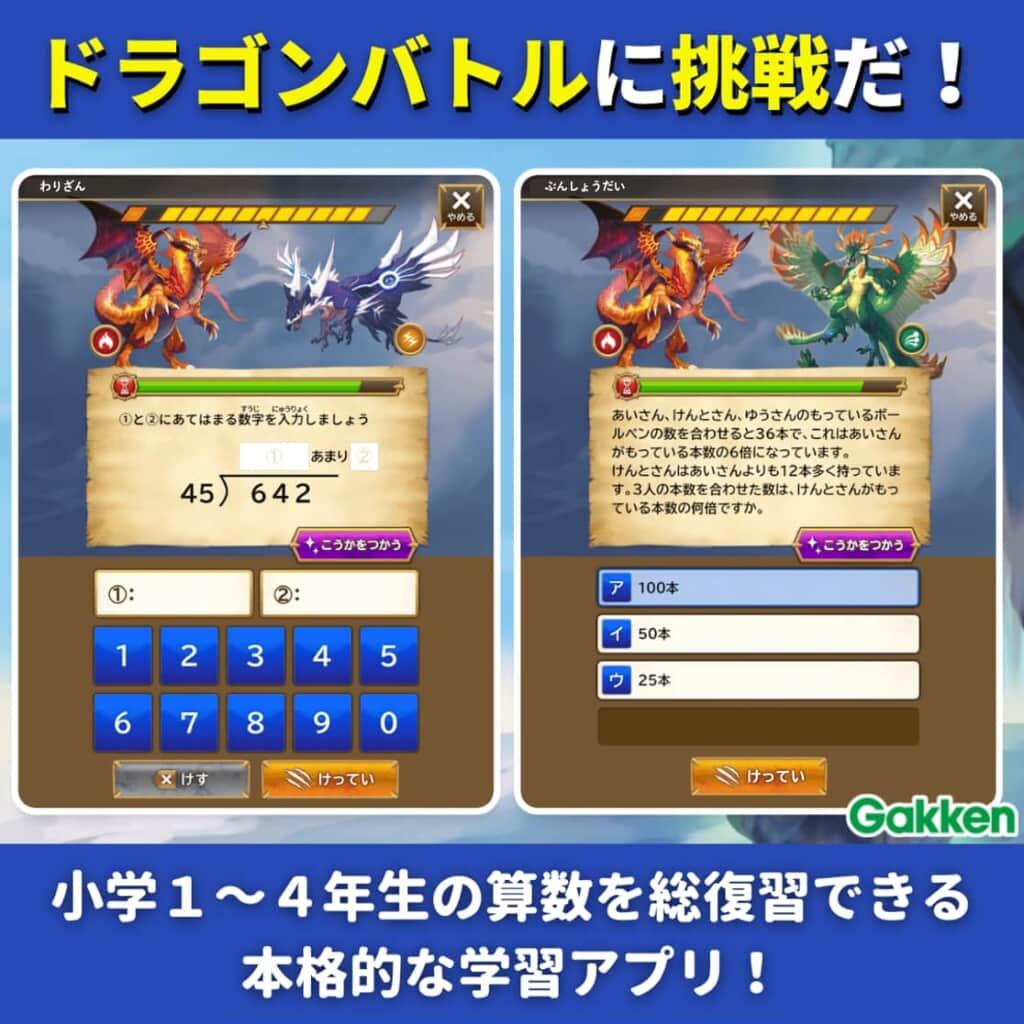 かっこいいドラゴンとバトル形式で繰り返し学習をするから、着実に算数の力が身につきます!