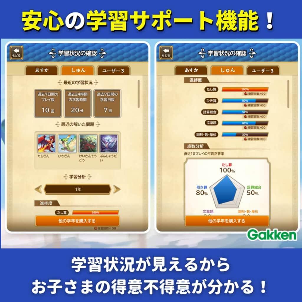 学習時間とプレイ回数、単元別の正答率など、保護者向けの学習管理機能を搭載!