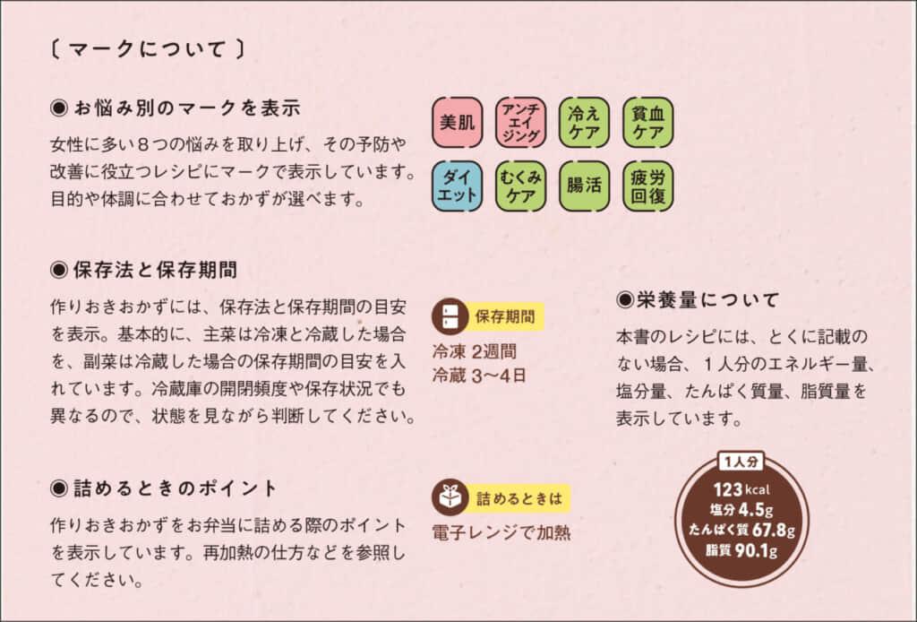 - 各レシピには改善が期待できる悩みや保存法などが一目でわかるマークつき