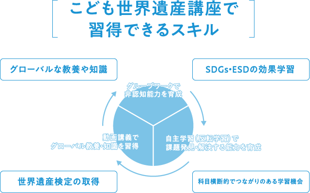 「非認知能力」はテストなどで数値化することが難しい内面的なスキルのことです。文部科学省の新学習指導要領で示されている「育成すべき資質・能力」と重なる部分が多く、これからの時代で最も必要とされている領域です。こども世界遺産講座ではグループワークを通し、「非認知能力」を育むカリキュラムを導入しています。