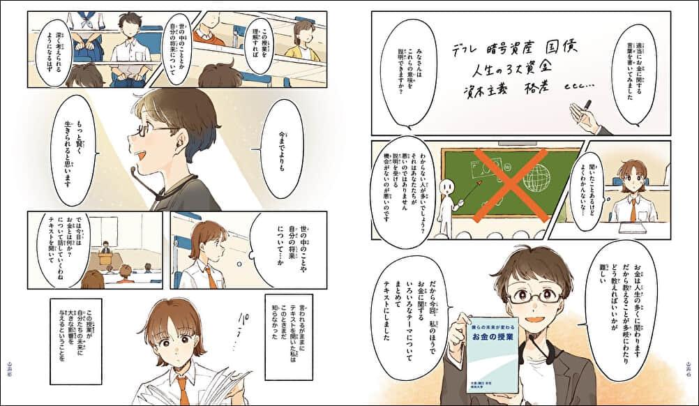 各章、マンガのあとには“お金”や“社会”、そして“生き方”についてのイラスト図解が続きます。見開きで1テーマ完結のため読みやすく、イラストをながめているだけでも要点がつかめます。