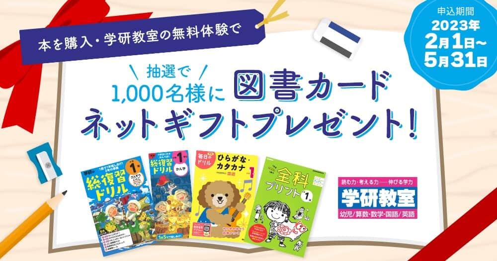 毎日のドリルを含む対象商品を購入し、キャンペーンシールから学研教室の無料体験学習を申込み、体験を完了すると抽選で1,000名様に、1,000円分の図書カードネットギフトをプレゼント!