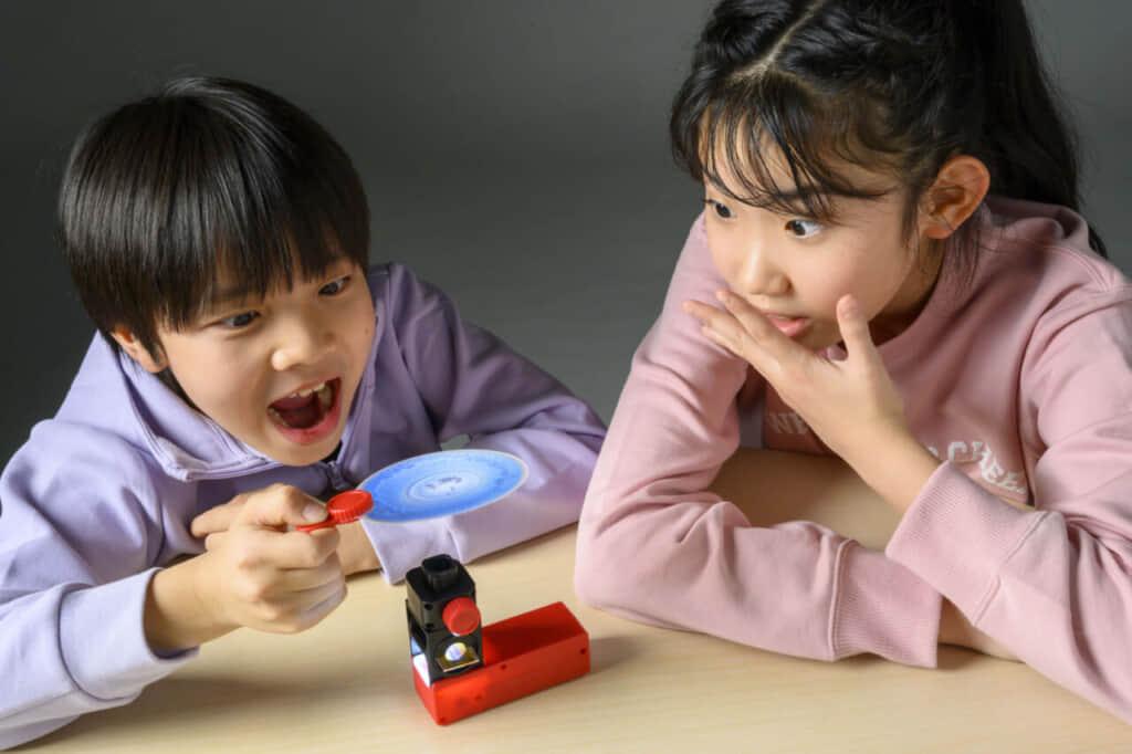 第2弾の組立キット「大図鑑プロジェクター」は、かべや天井をスクリーンにして、ほんとの大きさで生きものを映したり、リアルな星空を投影できる実験プロジェクター。付属の交換シートは全部で8種類。学研の図鑑LIVE編集部が制作した「恐竜」「陸と空の生物」「海の生物」「人体」に加え、プラネタリウムクリエーター大平貴之さんの天の川が映る「リアル星空」や、「星座」「妖怪アニメ」「工作」などもりだくさん。体がすっぽり入る大きさで映せるので、まるでほんものの世界に入りこんだような没入体験を味わえます。