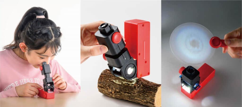 キットの「万能顕微鏡」はLED内蔵の50~100倍に拡大できる組み立て式の顕微鏡です。万能顕微鏡は、下から光を当ててプレパラートを観察する透過型、上から光を当ててものの表面を観察する反射型、虫めがねスクリーンに映す投影型*の3種類の実験を楽しめます。肉眼では見えないミクロの世界には、観察者を興奮させる発見がいっぱいです。