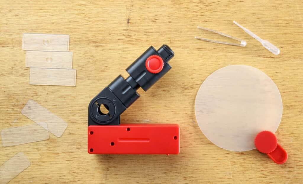 - キットには顕微鏡だけでなく、ミクロの世界の発見探しを手伝ってくれる道具が入っています!