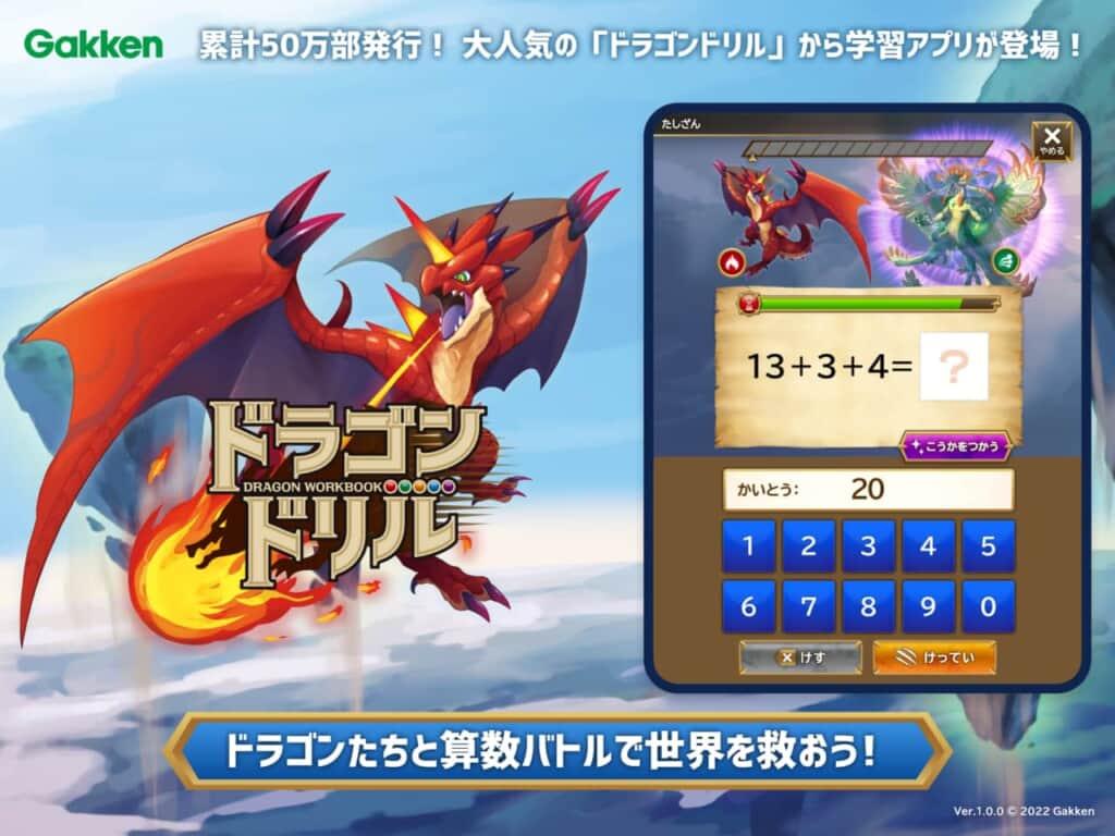 「勉強したらシールを貼ってドラゴンを復活させる」という仕組みが大好評の『ドラゴンドリル』の唯一の弱点……それは、子どもが夢中になるあまり「1冊をあっという間に解き終わってしまう」こと! そこで、思う存分お使いいただける、算数学習アプリを作りました。