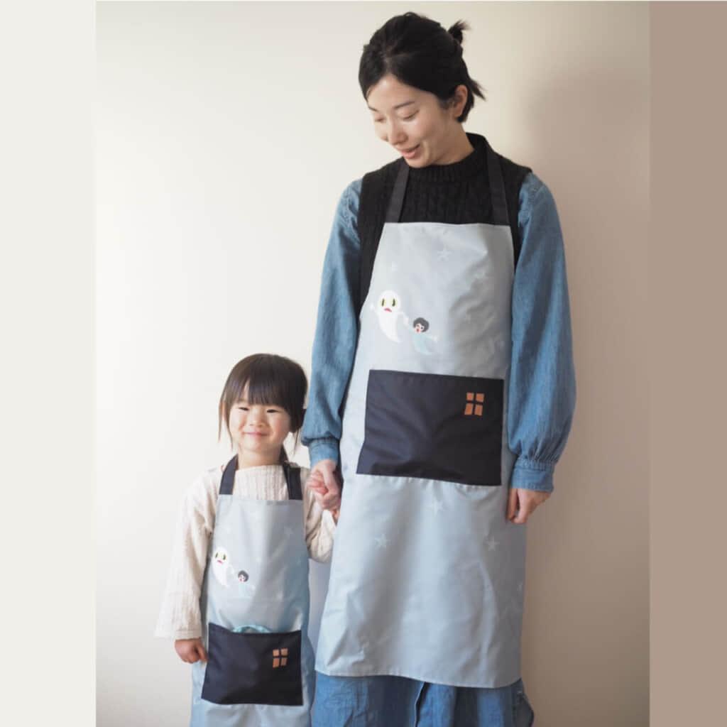 親子で「お揃い」ができるエプロン。ポケットから「おばけ」のマスコットが出てくるしかけつき。