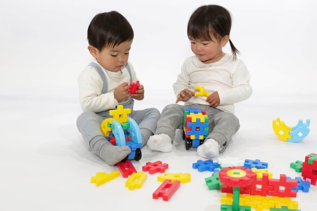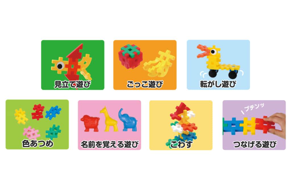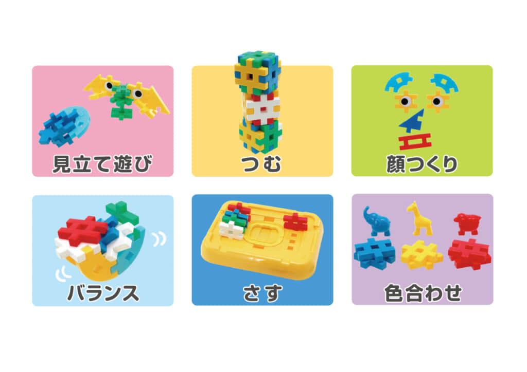 また、パーツが大きいため、1.5歳からお使いいただいても誤飲の心配がなく、お子さまのファーストブロックにぴったりです。最初は積む&こわす遊びからスタートし、食べ物や線路などに見立てる遊び、パーツを自由に組む遊び、そして頭の中で考えたものを作品にする遊びへと発展し、小学生になるまで長く遊んでいただけます。