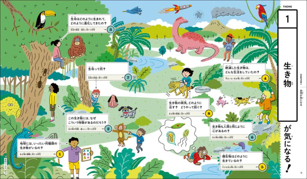 など、身のまわりの「気になる」を切り口にして、豊富なイラストとエピソードで、自然、環境、機械、科学、情報、生命、物語、暮らし、エンタメなど、さまざまなテーマに関わる208の学問分野を解説しています。まさに、学問の世界まるごとを網羅した図鑑です。