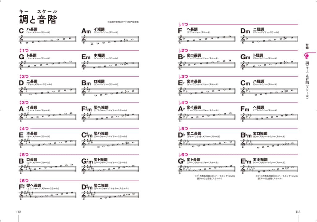 曲に挑戦するときの参考に、巻末付録として各調の音階と主要コードをまとめています。