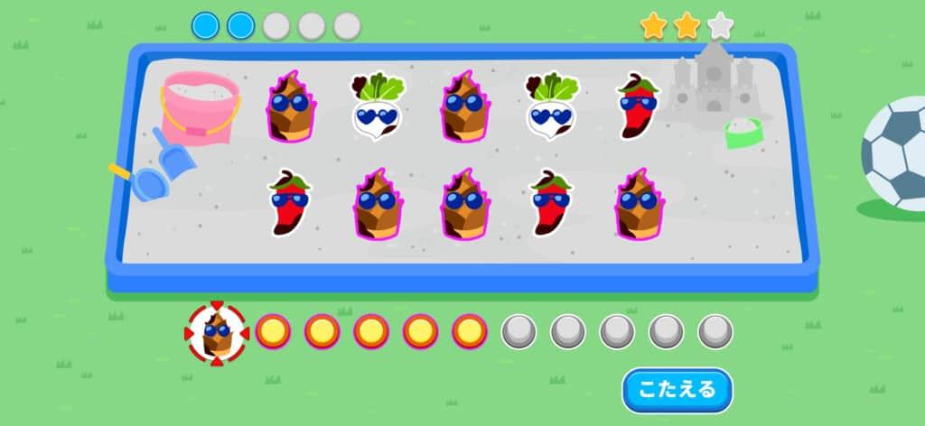 野菜の種類を見分けながら、10までの数を学習します。左から順に○をタッチしてかぞえることで、数を比べるときの基本を身につけます。
