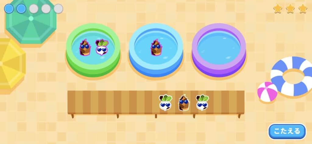 問題文の数に合わせて、キャラクターをプールに入れていきます。数を比較する力を育て、かけ算の基礎となる力も伸ばします。