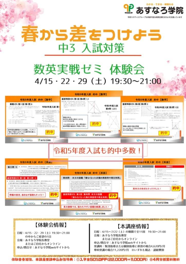 そして、令和6年度公立高校入試に向け、早くも対策の第1弾「数英実戦ゼミ」が、4月に開講します。