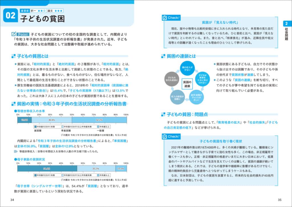 また、子どもの貧困、災害対策、デジタルトランスフォーメーション(DX)などのテーマは、公務員試験の論文でも問われるテーマとなっています。本書では、択一対策だけではなく、論文試験対策にも重点を置き、論文頻出テーマでは、現状や課題、取組についてもしっかりと解説しています。