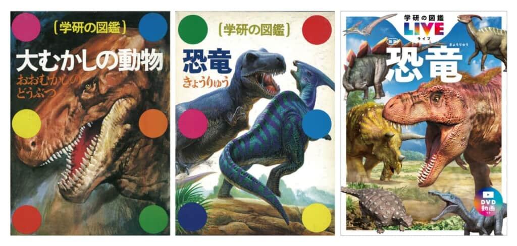 - 展覧会特設ショップに展示される歴代の恐竜図鑑。左『学研の図鑑 大むかしの動物』(1972年 学習研究社刊)、中央『学研の図鑑 恐竜』(1990年 学習研究社刊)、右『学研の図鑑LIVE 恐竜新版』(2022年 Gakken刊)