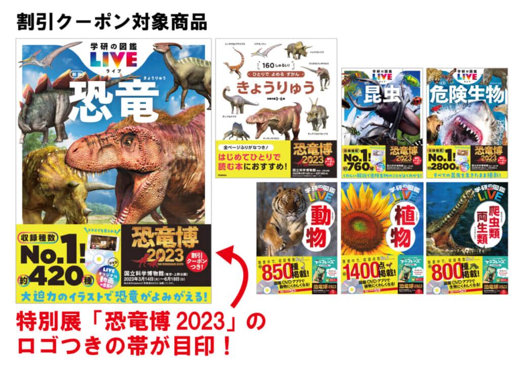 特別展「恐竜博2023」の開催を記念して、学研の図鑑の帯に入場料割引クーポンコードがついてきます。対象商品は、『学研の図鑑LIVE 恐竜新版』『同 昆虫新版』『同 危険生物新版』『同 動物』『同 植物』『同 爬虫類・両生類』『ひとりでよめるずかん きょうりゅう』の7点です。