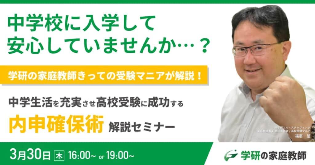 株式会社 学研ホールディングス(東京・品川/代表取締役社長:宮原博昭)のグループ会社、株式会社学研エル・スタッフィング(東京・高田馬場/代表取締役社長:伊藤弘雅)が運営する学研の家庭教師が「中学生活を充実させ高校受験に成功するための内申確保術セミナー」を2023年3月30日(木)に開催いたします。