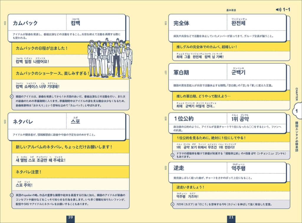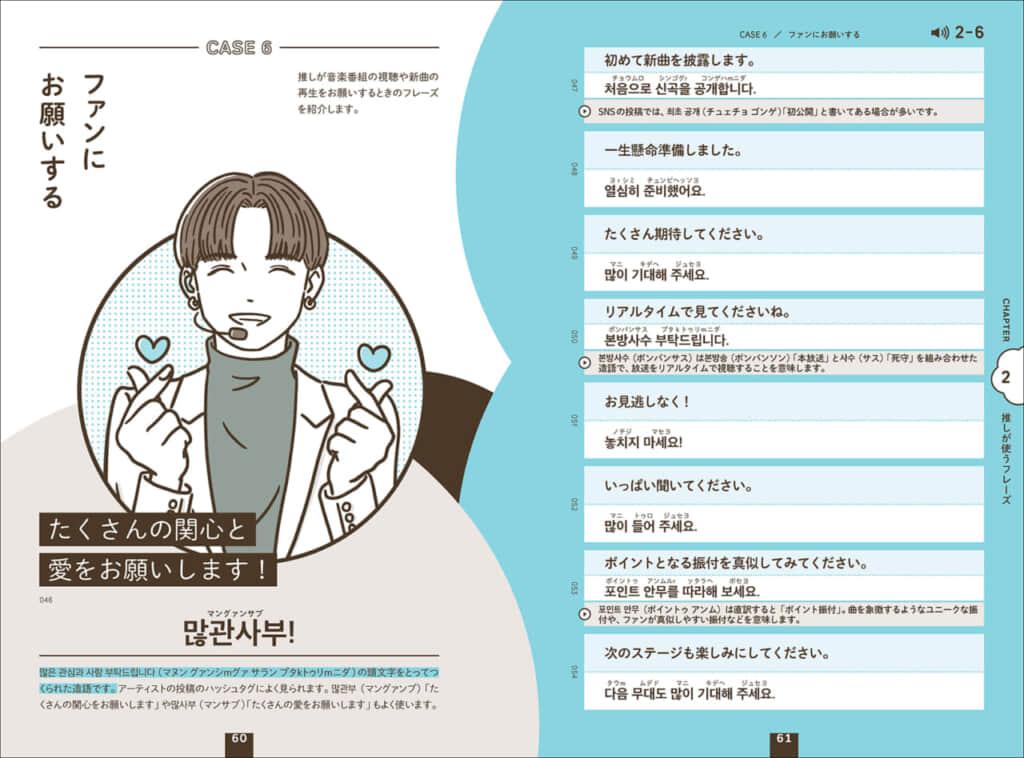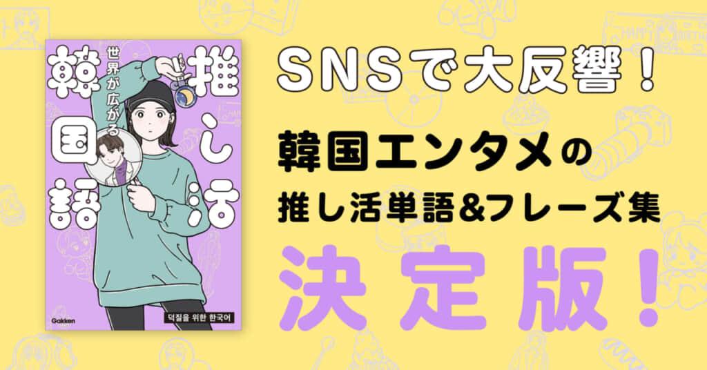 『世界が広がる 推し活韓国語』は、韓国エンタメを愛する方々を対象に、推し活で使えるリアルな韓国語表現を紹介した本です。韓国人のエンタメオタク全面協力のもと、「カムバック」「チッケム」などの367語と、「マジでケミ爆発」「ティーザーだけで優勝してる」などの517フレーズを掲載しています。