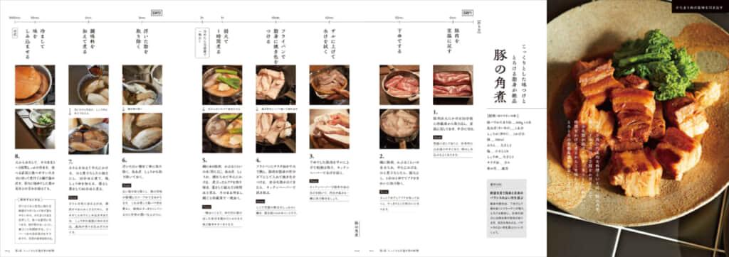 肉料理のパートでは、じっくりと火を通すことで劇的に美味しくなるレシピを紹介。たとえば「豚の角煮」は、下ゆでしてアクを取り除き、フライパンで焼き目をつけてから、弱火で1時間コトコト煮込みます。さらに、ひと晩おいて、余分な脂を取り除いてから煮込むこと1時間弱。そのまま2~3時間冷まして、ようやく完成です。こう書くと、とても手間がかかりそうに思われるかもしれませんが…、ひとつひとつの工程は、いたってシンプル。材料も身近なものばかりなので、時間さえかければ、誰でも失敗なく、極上のとろける角煮が作れます。