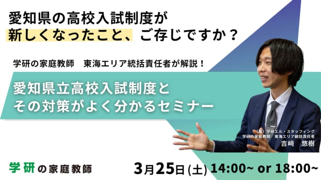 株式会社 学研ホールディングス(東京・品川/代表取締役社長:宮原博昭)のグループ会社、株式会社学研エル・スタッフィング(東京・高田馬場/代表取締役社長:伊藤弘雅)が運営する学研の家庭教師は「愛知県立高校入試制度とその対策がよく分かるセミナー」を2023年3月25日(土)に開催いたします。