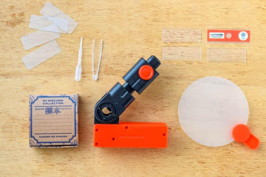 - キットには顕微鏡だけでなく、ミクロの世界の発見を手伝ってくれる道具が入っています!