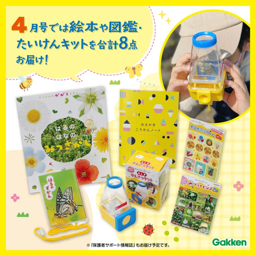 4月号では「はるのはなのみつさがし」「はるのずかん」「おえかきこうかんノート」「ふしぎかんさつキット」「みつけてビンゴ」「やるきアップシール」「図鑑専用フォルダー」「保護者サポート情報誌」など絵本や図鑑・たいけんキットを合計8点お届け!