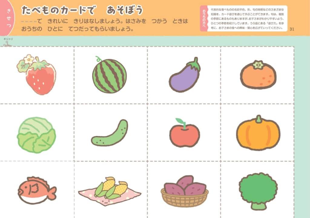 「きせつ」のワークの中にある「たべものカード」は、身近な食べものの名前や色、旬の時期などのさまざまな知識を、カード遊びを通じて学ぶことができます。お子さまの食への興味・関心を高めるのにぴったり!