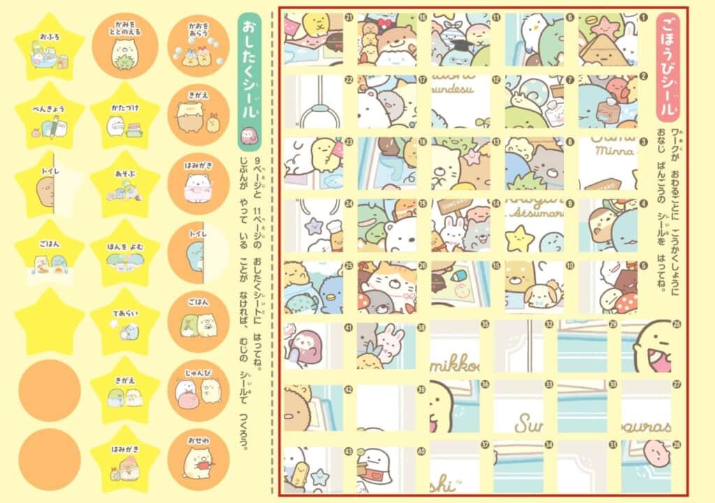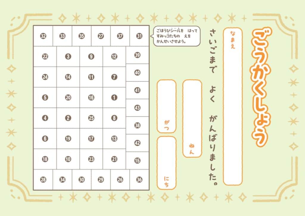- ごほうびシール(写真上の赤枠部分)をごうかくしょう(写真下)に貼っていくと、1枚の絵が完成する
