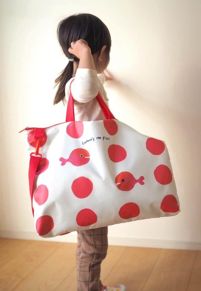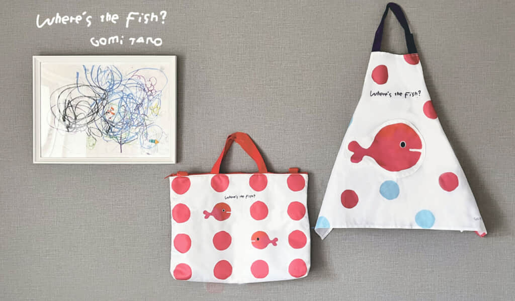 五味太郎作のロングセラー絵本『きんぎょが にげた』のきんぎょと赤いみずたま模様がデザインされた、入園準備にぴったりなアイテムが登場。