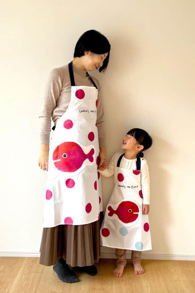 親子で「お揃い」ができるエプロン。きんぎょの形をした大きなポケットがポイント。