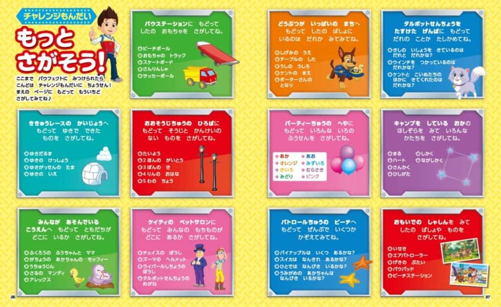 動物や食べものなどいろんなものを探して、パウ・パトロールの任務をお手伝い!チェイスやマーシャルたち人気のキャラクターがいっぱいのイラスト問題が11問収録されています。難易度の低い順に並んでいるので、小さなお子さまでも取り組みやすくなっています♪