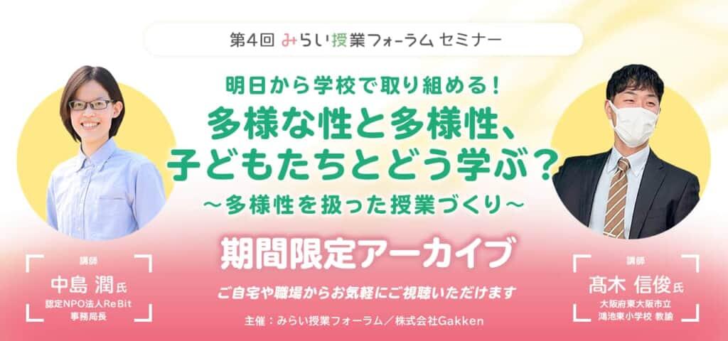 株式会社 学研ホールディングス(東京都品川区、代表取締役社長:宮原 博昭)のグループ会社、株式会社 Gakken(東京都品川区、代表取締役社長:五郎丸徹、以下「Gakken」)は、教育出版 株式会社(東京都江東区、代表取締役社長:伊東 千尋)と共同研究事業である「みらい授業フォーラム(https://www.mirai-jf.jp/)」において、2023年3月4日(土)に開催した、オンラインセミナー「明日から学校で取り組める! 多様な性と多様性、子どもたちとどう学ぶ? ~多様性を扱った授業づくり~」を期間限定でアーカイブ配信いたします。