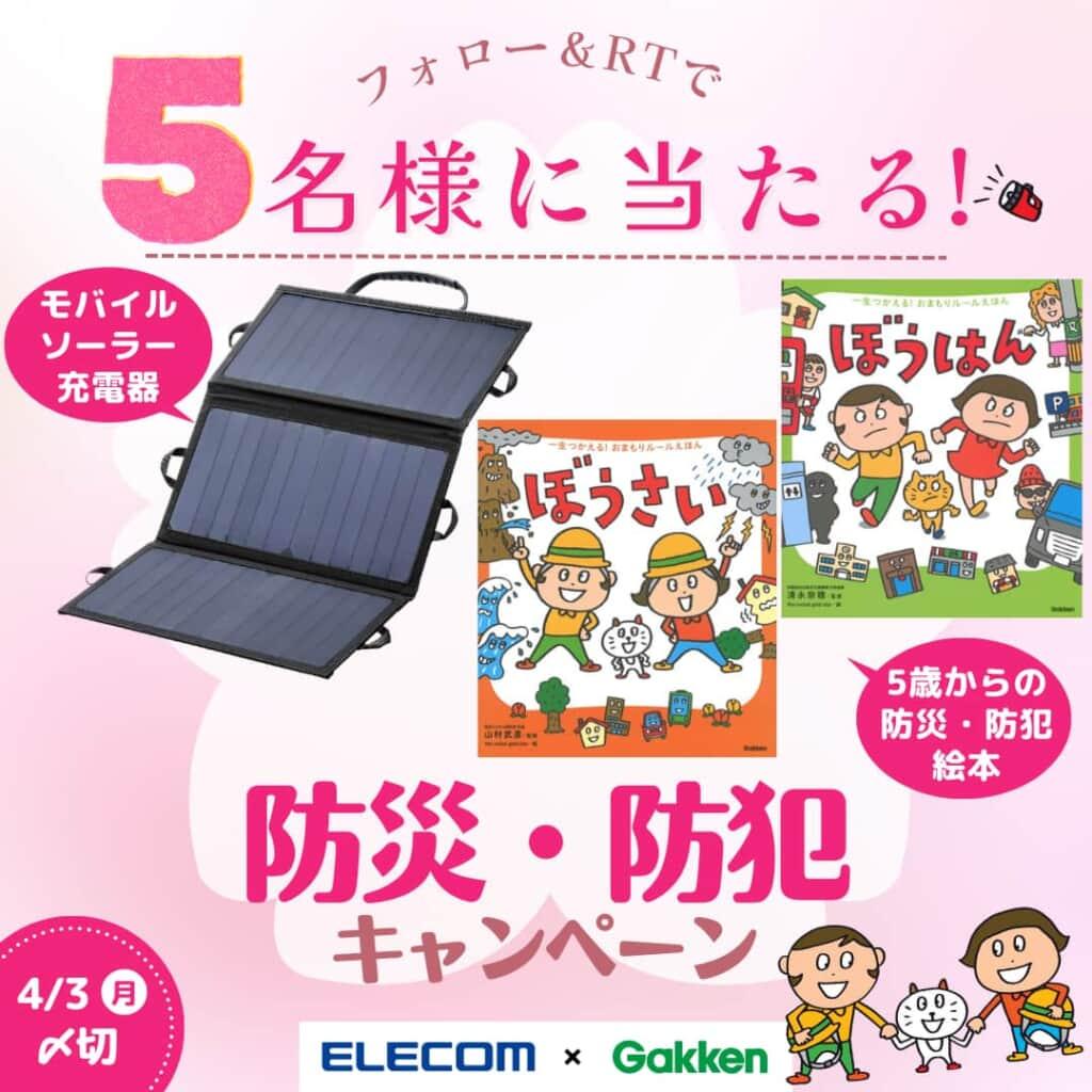 IT周辺関連製品の開発、製造、販売を手掛けるエレコム株式会社と、Gakkenのコラボレーションが実現。災害時やアウトドアにも便利な『モバイルソーラー充電器』と、書籍『おまもりルールえほん ぼうさい』『おまもりルールえほん ぼうはん』2冊セットが抽選でもらえるプレゼントキャンペーンを実施中です。