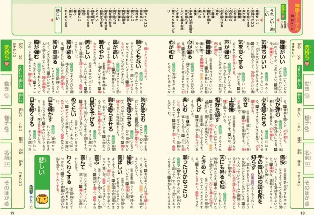 ページ上部の「類語のテーブル」には、そのページにある類語がすべて掲載されています。言葉を一覧として見られ、さまざまな言葉との出会いが生まれてお子さまの語彙が増えることにつながります。