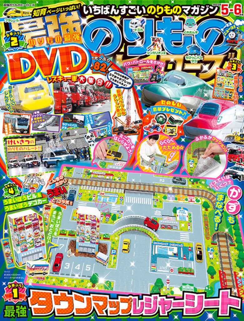 日本一のキッズ向けのりもの雑誌※『最強のりものヒーローズ5-6月号』は、ふかふか素材が嬉しいビッグサイズのタウンマップレジャーシートが付録!! 駐車場の数はいくつかな? バス停の数はいくつかな? など、遊びながら数も学べちゃう知育にもぴったりな最強のレジャーシートだ☆ 人気のお菓子「うまい棒」コラボのビルやデコカーの工作付き! レジャーシートのマップと遊べて楽しいぞ♪ DVDではレスキュー車大図鑑や、会えたらラッキー!?なちょっとめずらしい新幹線を大特集! 他にも、警察ののりものが大行進のイベントや鉄道のすごいジオラマ、パワフルなクローラクレーンを紹介!! 東日本を走る通勤電車や新しく開業した新横浜駅の様子も必見だ! たっぷり55枚のシールもついた充実の1冊! 本誌ではパウ・パトロールの楽しいさがし絵遊びができちゃうぞ! お見逃しなく☆
