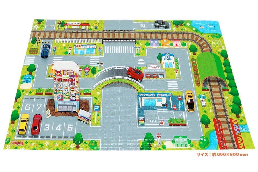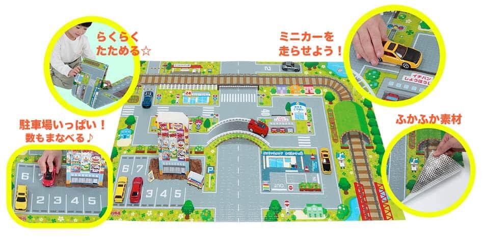 ミニカーと一緒に遊べる楽しいタウンマップデザイン! 駐車場はいくつあるかな? バス停はいくつあるかな?と、探し遊びをしながら自然に数も学べちゃう☆
