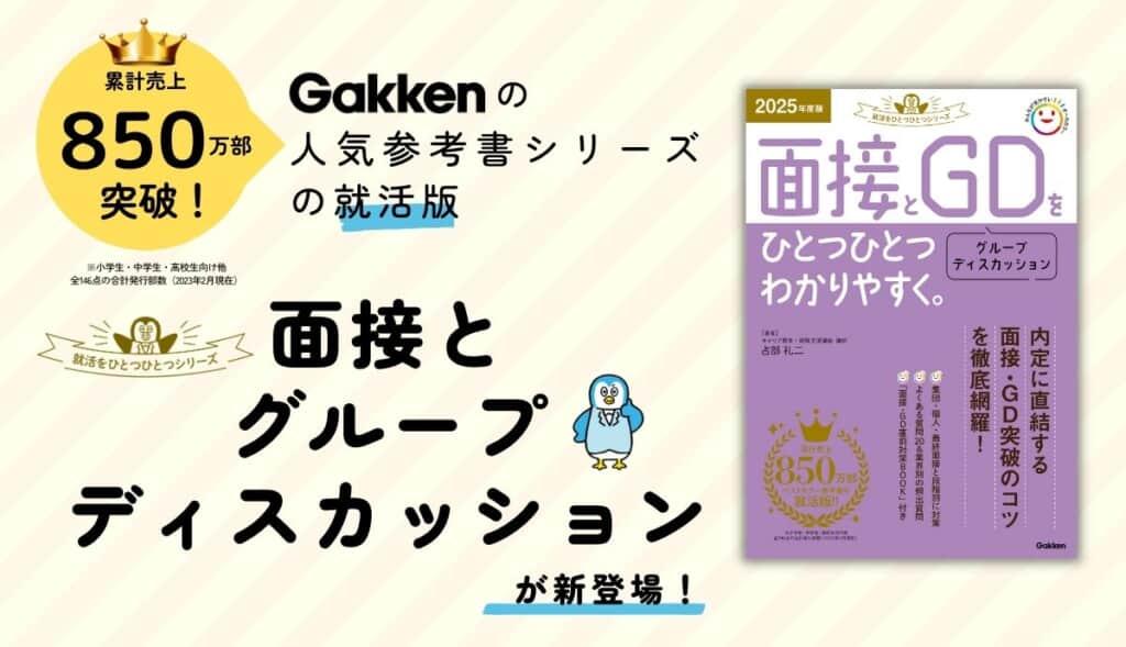 株式会社 学研ホールディングス(東京・品川/代表取締役社長:宮原博昭)のグループ会社、株式会社 Gakken(東京・品川/代表取締役社長:五郎丸徹)は、「就活をひとつひとつ」シリーズより『面接とグループディスカッションをひとつひとつわかりやすく。』を2023年3月16日(木)に発売いたしました。あわせて、企画立案社員へのインタビューを公開しました。