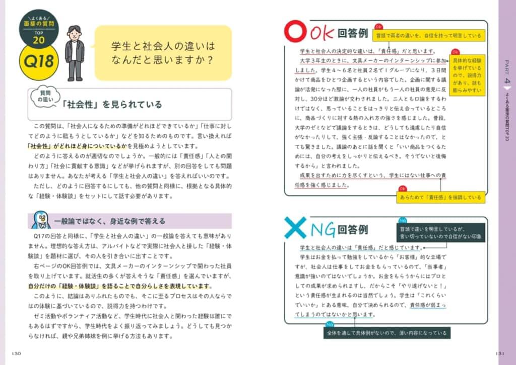 「学生時代に頑張ったことを教えてください」「就活の軸を教えてください」など、面接でよく聞かれる質問20をピックアップ。OK回答例、NG回答例付きなので、ポイントがよくわかります。業界別のよくある質問もカバー。