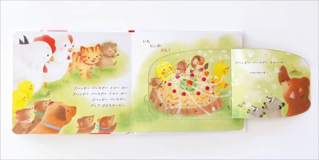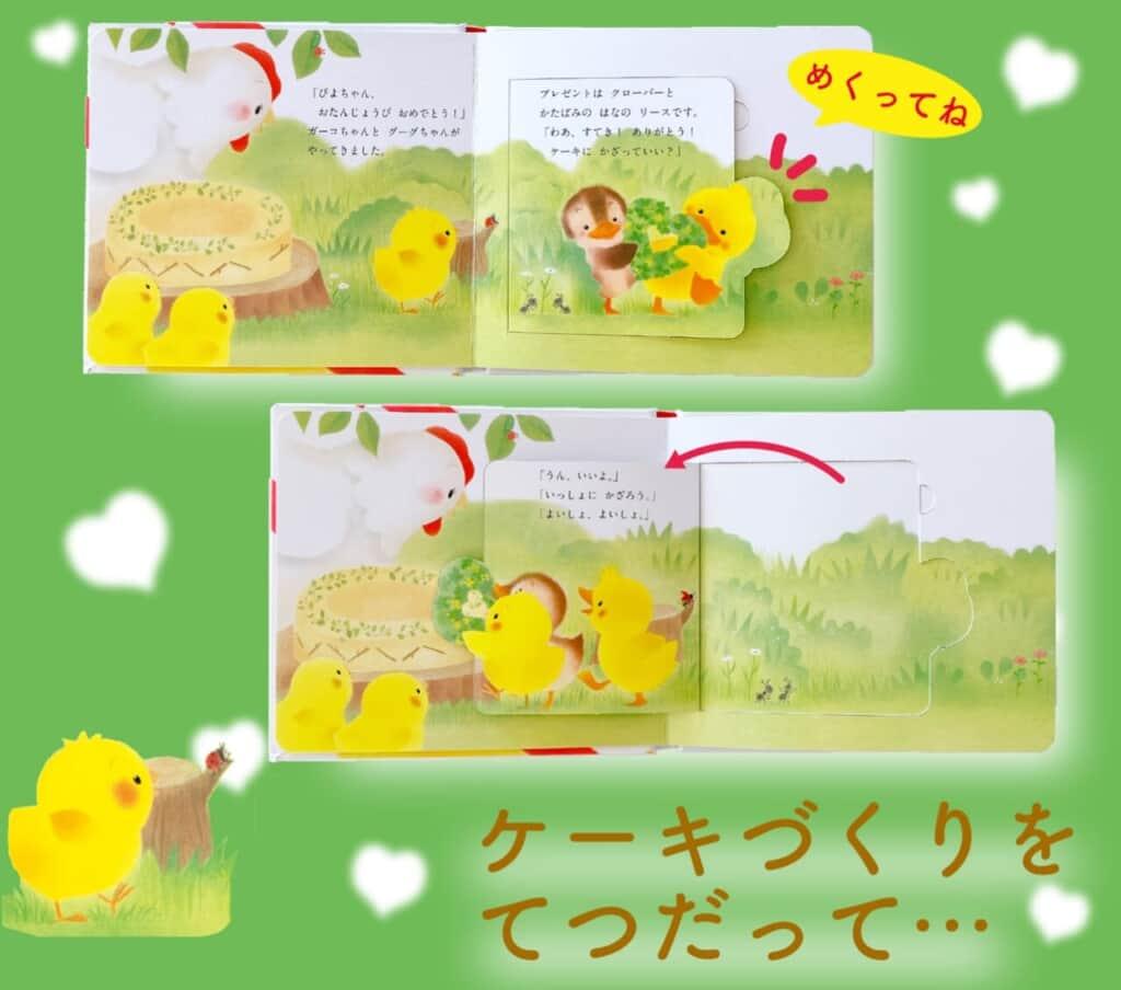 - 『ぴよちゃんの おたんじょうび』本文ページより。しかけをめくると…