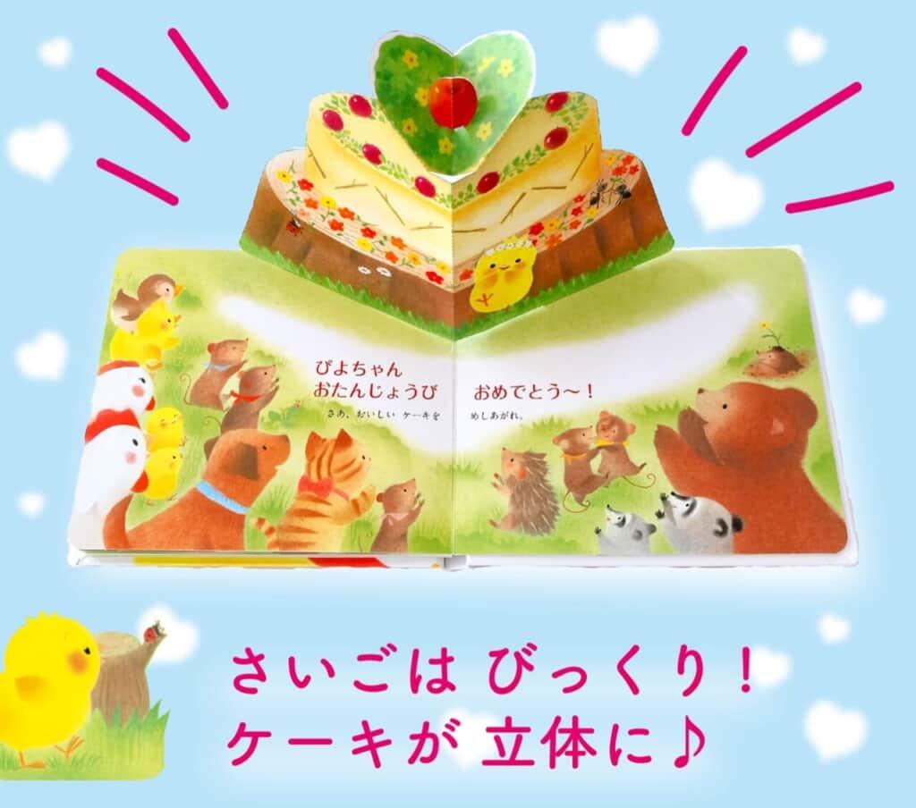 - 『ぴよちゃんの おたんじょうび』本文ページより。ケーキがダイナミックに立ち上がります