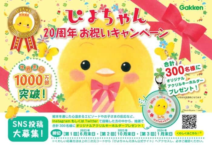 20周年を記念して、 『ぴよちゃんの おたんじょうび』を含むぴよちゃんのえほんシリーズ全体で、SNSキャンペーンを実施中! 写真つきのSNS投稿で合計300名様にオリジナルアクリルキーホルダーが当たります!(最終締め切り2024年1月31日)。詳しくは公式サイトにて掲載中。