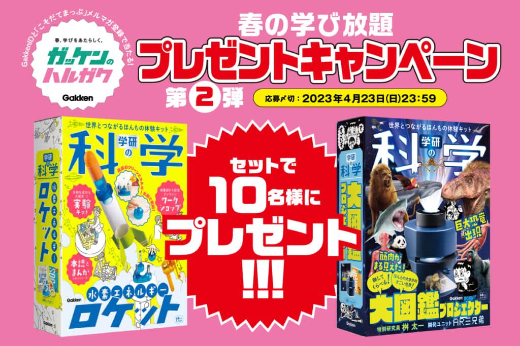 第2弾のプレゼントは、本格的な実験キットと書籍がセットになった「学研の科学」(https://kagaku.gakken.jp/)。『水素エネルギーロケット』『大図鑑プロジェクター』の2つをセットにして抽選で10名様にプレゼントいたします。