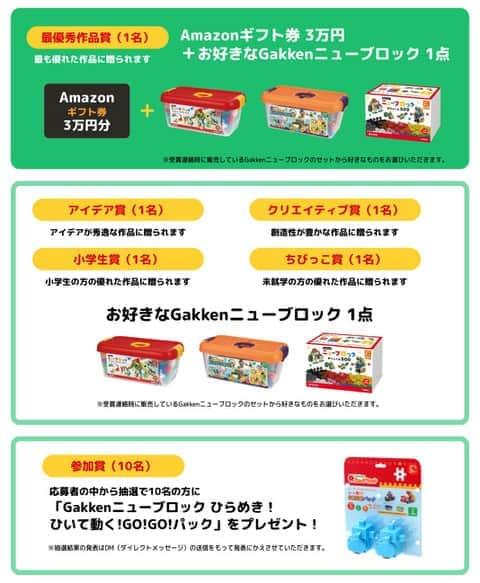 本コンテストでは、応募作品の中から5つの賞「最優秀作品賞」「アイデア賞」「クリエイティブ賞」「小学生賞」「ちびっこ賞」(各1名)を選定、「最優秀作品賞」の方にはAmazonギフト券3万円とお好きなGakkenニューブロックを進呈します。