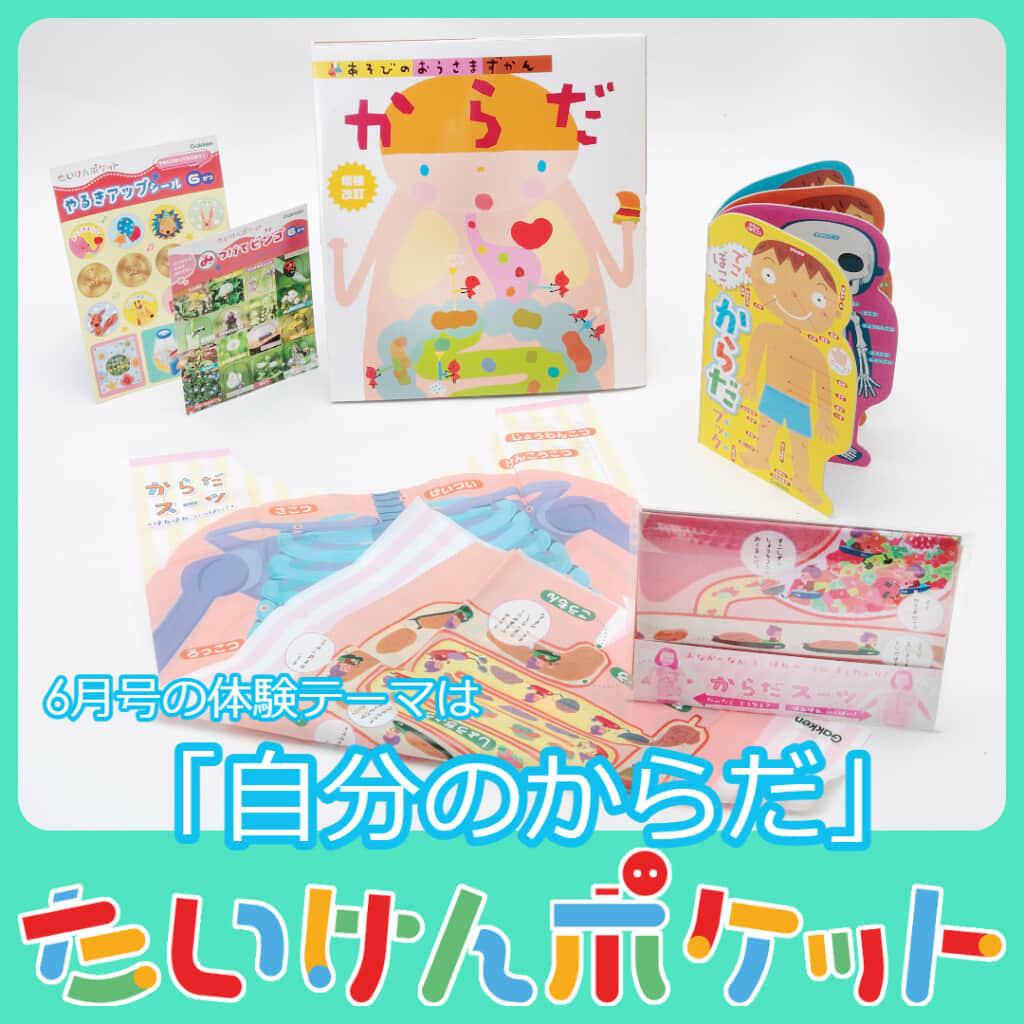 6月号では着る図鑑!?「からだスーツ」「あそびのおうさまずかん・からだ」「でこぼこからだブック」など絵本や図鑑・たいけんキットを合計5点お届け!毎月、5・6歳の発達や好奇心にぴったりな体験テーマがセットで届きます。