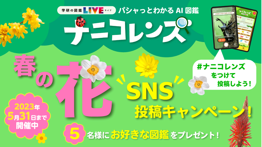 株式会社 学研ホールディングス(東京・品川/代表取締役社長:宮原博昭)のグループ会社、株式会社 Gakken(東京・品川/代表取締役社長:五郎丸徹)は、iOS・Android対応アプリ「ナニコレンズ」で撮った花の写真をSNSに投稿すると抽選で5名様に図鑑LIVEシリーズの中からお好きな図鑑を一冊プレゼントする「春の花 投稿キャンペーン」を2023年5月31日まで実施中です。